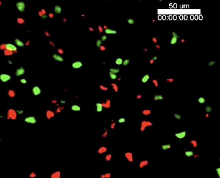 Migratory behavior of fluorescently labeled wild-type (green) and Myo1g/ OT-I (red) cells inside wild-type lymph nodes (LN). The movie cycles through first exploring the volume, showing that these cells occupy the same physical space within the LN. The movie then plays and then each cell phenotype is separately tracked and then tracked together. Tracks are color-coded according to the mean track speed. Scale bar represents 50 microns.