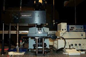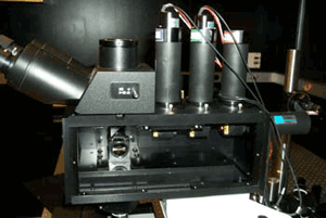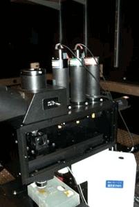 The PMT array. Beamspitting dichroics for multicolor detection are indicated.